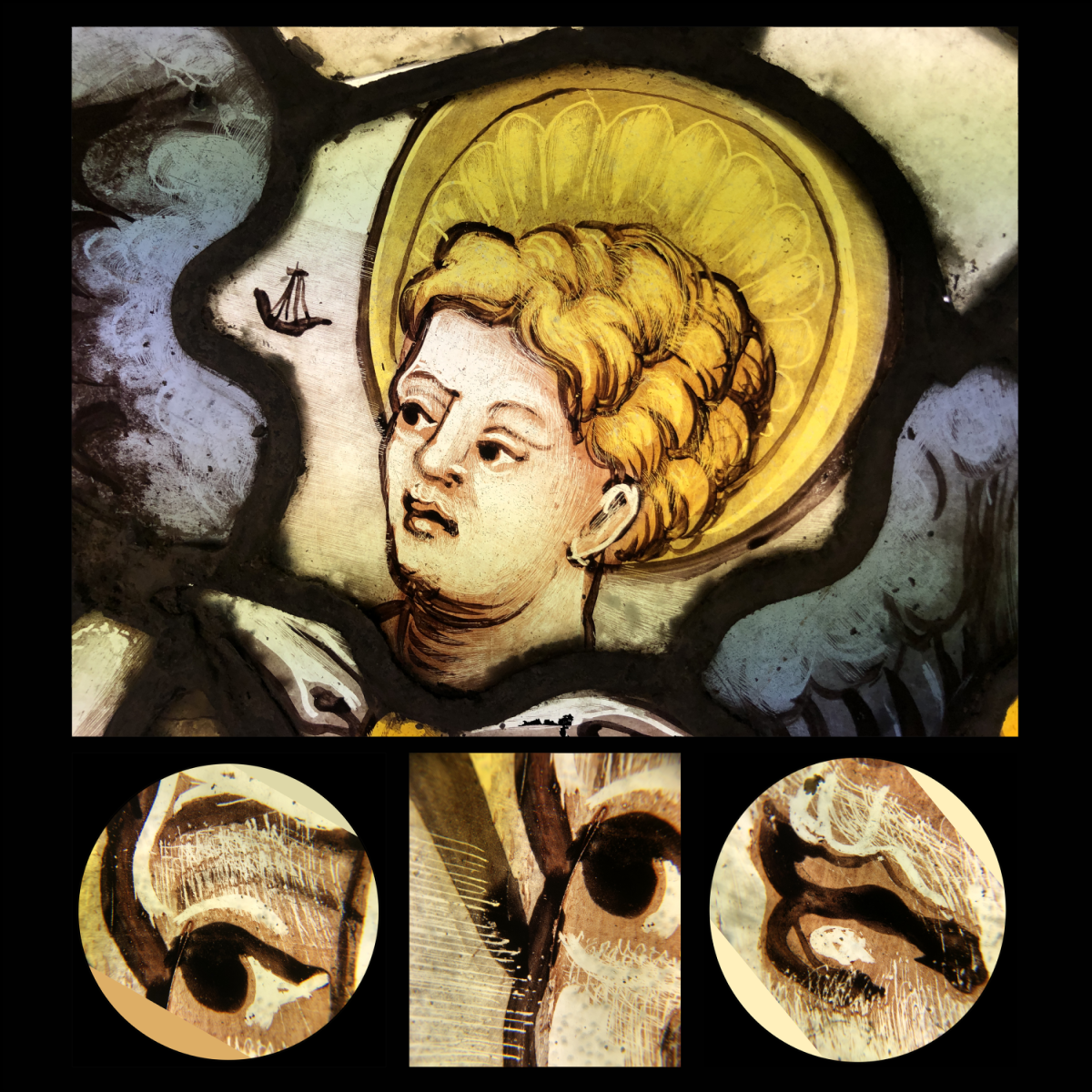 From top left clockwise: Lichen and algae on the exterior surface of the panels; evidence of historic re-painting and re-firing on lettering suffering from paint loss; delicate painted detail; thirteenth-century stained glass showing trace lines, smear shading and glass corrosion (pitting).