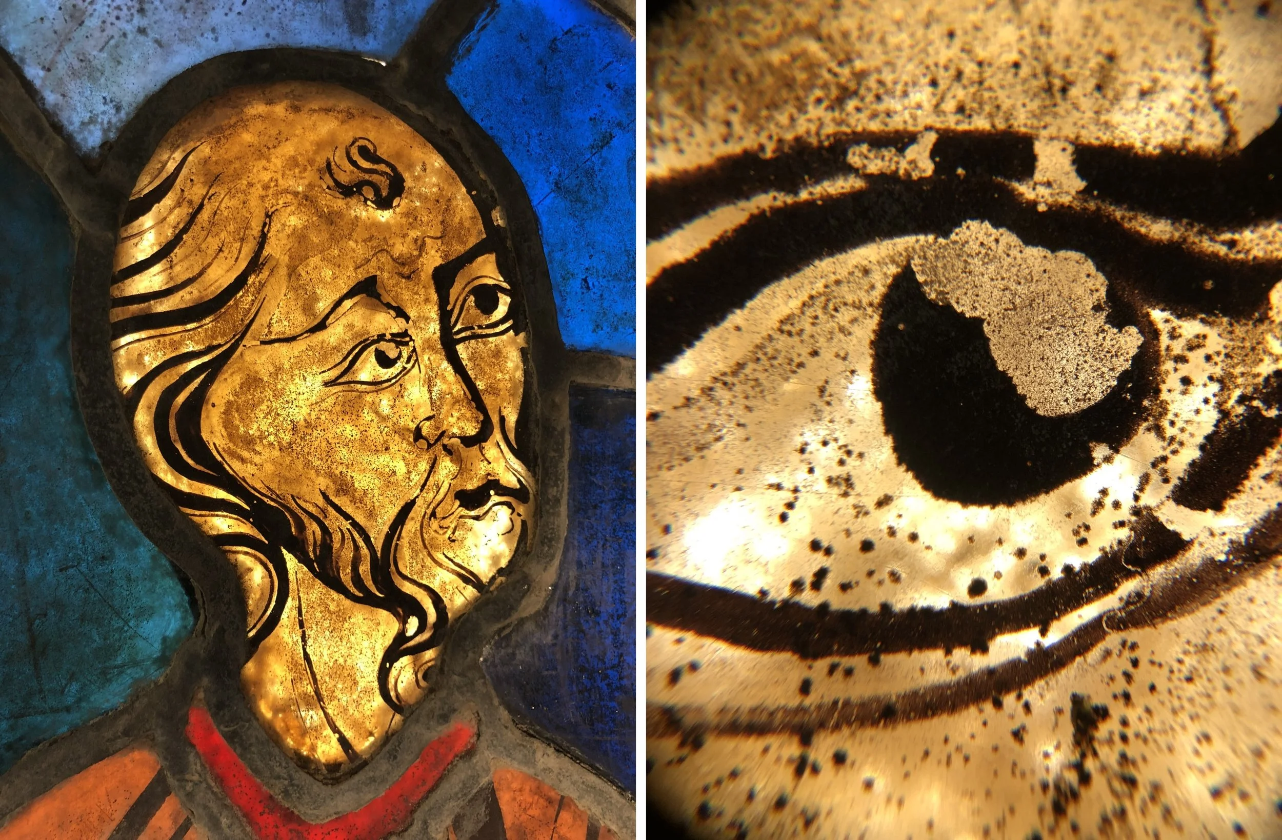 Thirteenth-century glass painting (left) and the view of the eye through the microscope (right) where you can see glass corrosion (pitting), paint loss, trace lines and smear shading lines.
