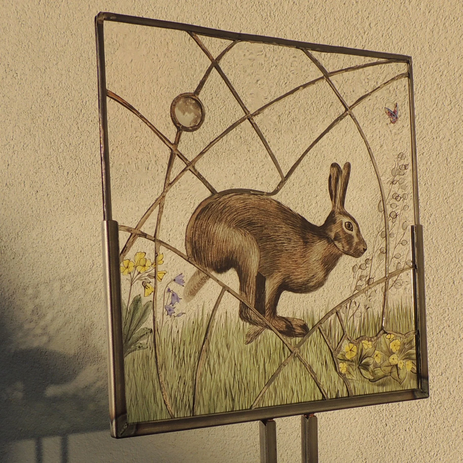 This panel was made to take part in the BSMGP’s “Inspired by Morris” exhibition in 2024. I was inspired to use chicken wire and the climbing evergreen Akebia Quinata to reflect the evolution of materials and aesthetics in stained glass. The currently-popular, resilient, adaptable Akebia respects Morris's organic forms, while industrial chicken wire underscores the blend of past and present, beauty and functionality—honouring Morris's legacy while embracing modernisation. Mid-blue antique glass, grisaille, enamels, 30x30cm.