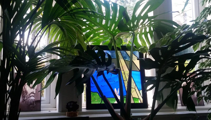 Having fallen in love with the thirteenth-century ornamental grisaille glass of Altenburg Abbey in Germany in 2016, I made this panel as part of a series to show some of the possibilities of foliage in a variety of styles in stained glass. I love the way this panel shows the different effects of using various techniques to obscure the passage of light through glass (the cross-hatching behind the leaves, the light matte behind the leaf top-left, and the thick matte in the border with circles scratched out).