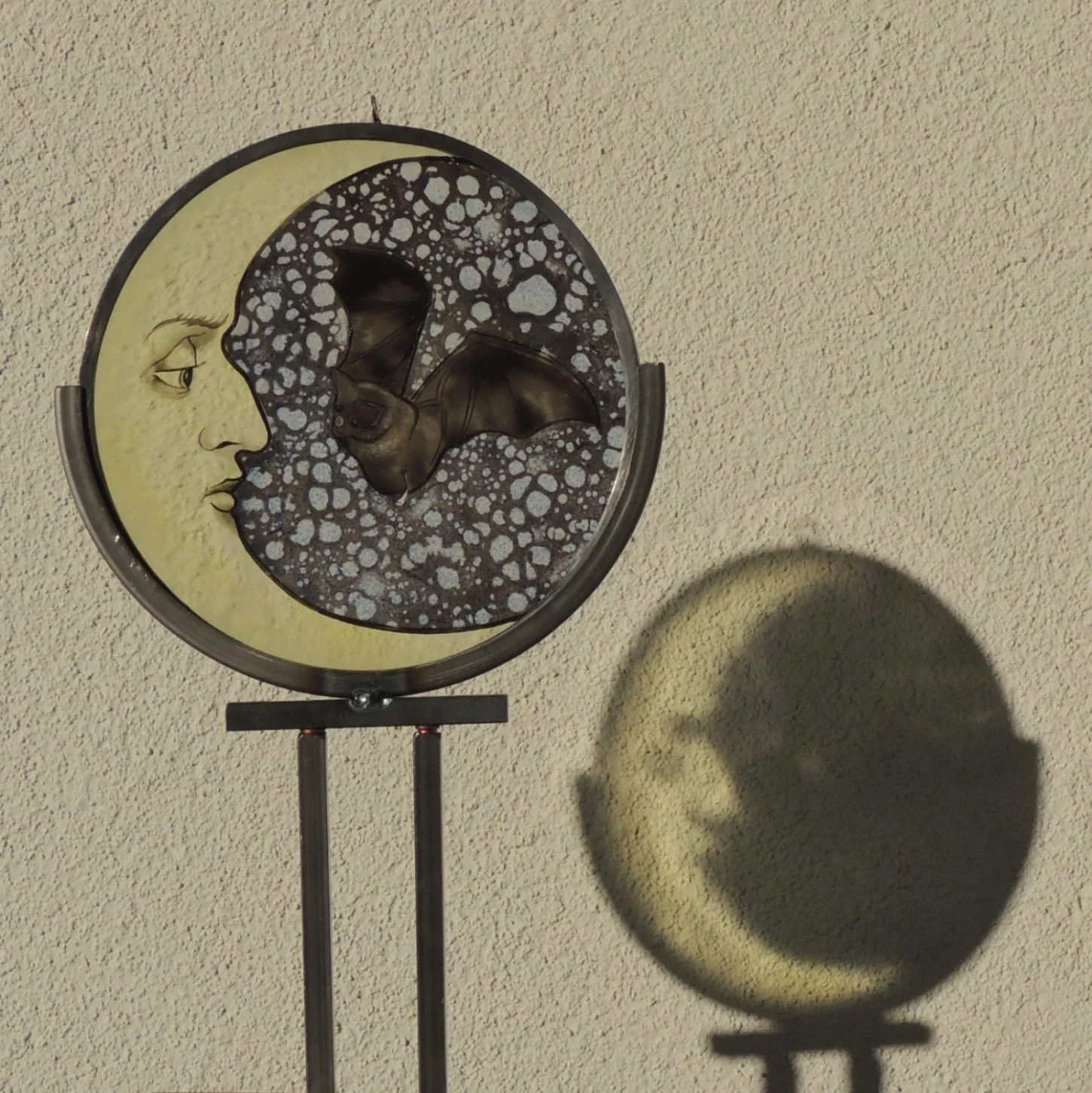 I made a copy of a bat and moon roundel that I have admired for a long time. I painted the glass front and back, then added enamel for subtle colour.